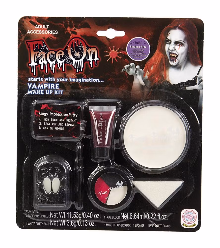 FaceOn Vampyr Sminkset I lager. 0 kr 109 kr Face-On vampyr sminkset består av ett par huggtänder, en tub fejkblod, ansiktsfärg, make-up applicerare samt en svamp. Ansiktsfärgen är oljebaserad Flera populära produkter Svart Röd Lång Peruk 179 kr 199 kr Vampyrtänder Huggtänder och blodampuller 2.6cm 29 kr 49 kr Naturlig Bob Blond Kort Peruk 179 kr 199 kr Lunar Witch Häxdräkt Maskeraddräkt 349 kr 399 kr Tatueringar Halloween skräck 29 kr 39 kr Sminkset lyser i UV Neon 49 kr
