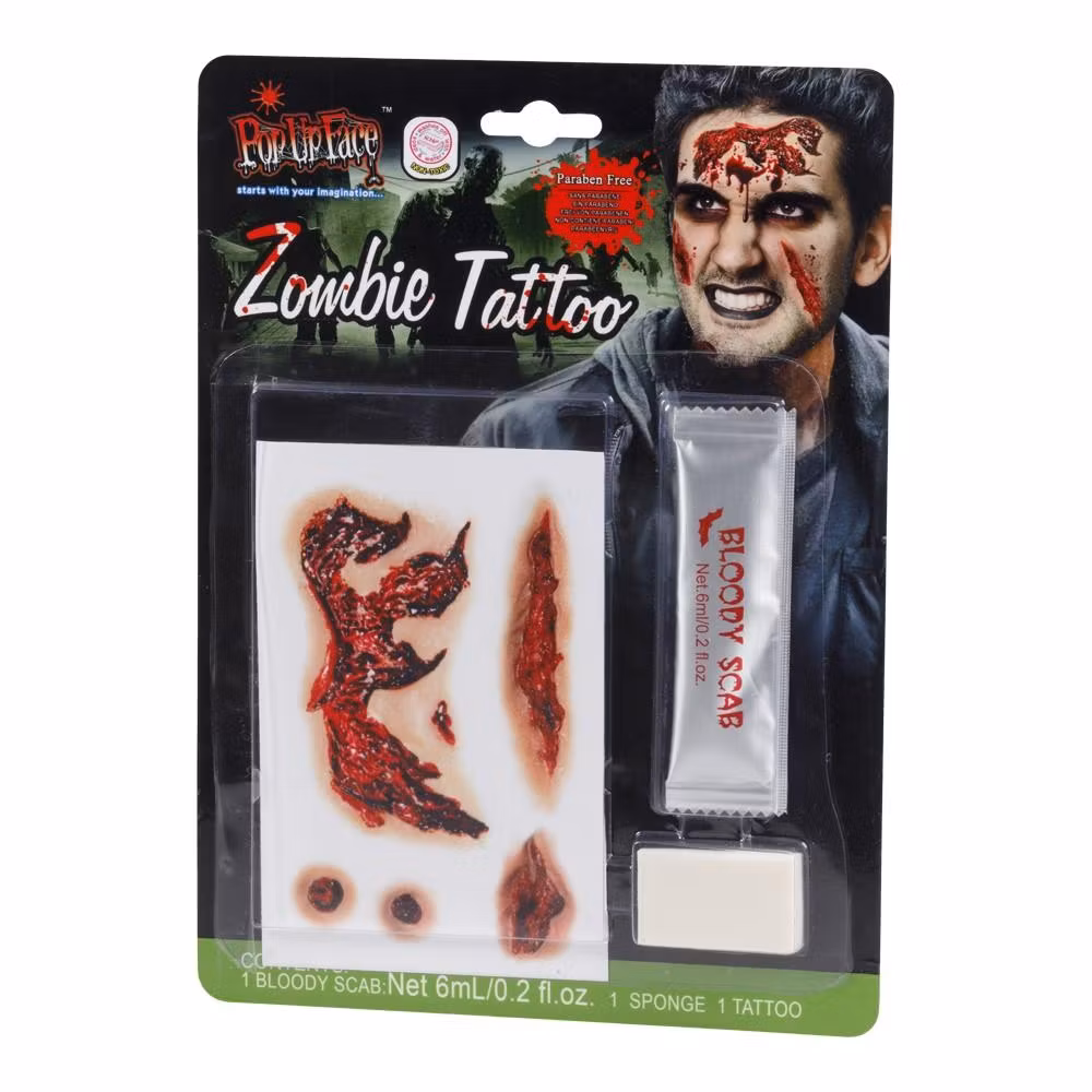 Zombie Sårtatueringar och Blod omfattar ett set med fyra temporära zombie sårtatueringar samt en förpackning koagulerat fakeblod. Medföljer även en svamp för enkel applicering.